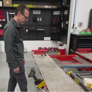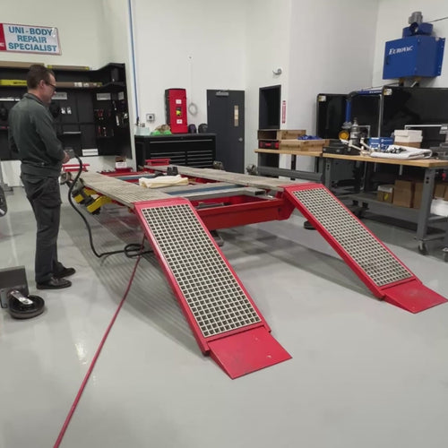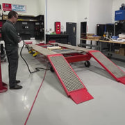 Le Griffon 2.8T Evolution VB mesure 4,35 m/14'3" de long Capacité de charge : 2 800 kg/6 172 lb. Doté d'un élévateur central pour le chargement sur les meubles ou sur le Cameleon, cet élévateur central se déplace d'avant en arrière et latéralement. Ce banc s'incline pour un meilleur accès. Mobile, il est doté de rampes composites légères et faciles à déplacer. Les pinces de seuil sont courbées, ce qui permet de les maintenir sur le banc une fois les rampes installées. Ce banc ne se soulève ni ne s'abaisse , mais sa hauteur de travail est idéale pour la plupart des opérations.